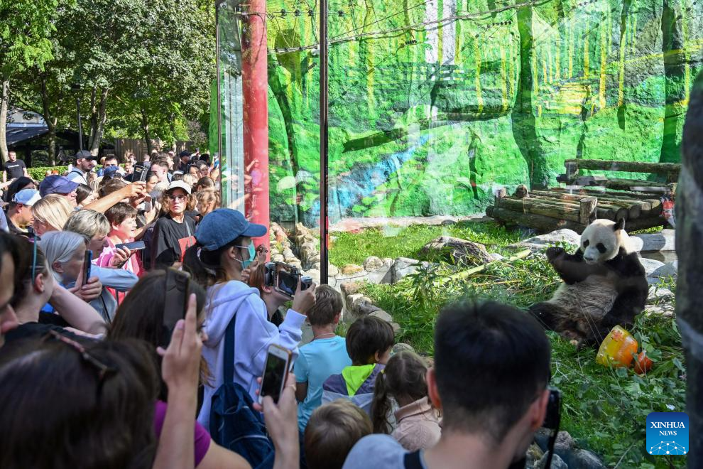 People take photos of Giant panda Ru Yi at the Moscow Zoo in Moscow, Russia, July 31, 2024. (Xinhua/Cao Yang)