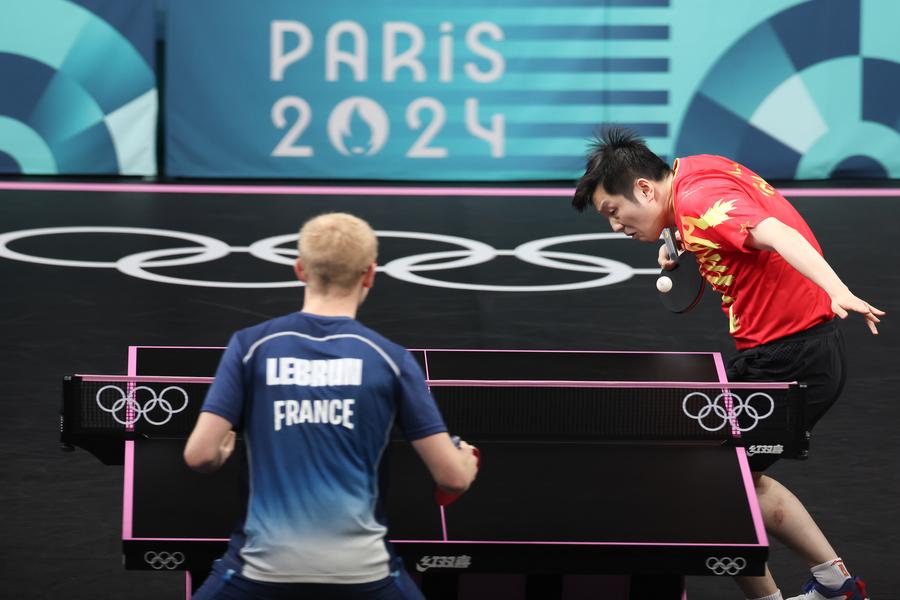 Fan Zhendong (top) of China in action during the men's singles semifinal match of table tennis against Felix Lebrun of France on Aug. 2, 2024. (Xinhua/Liu Xu)