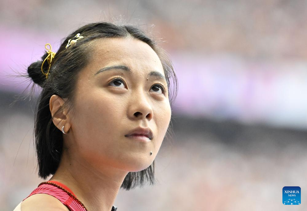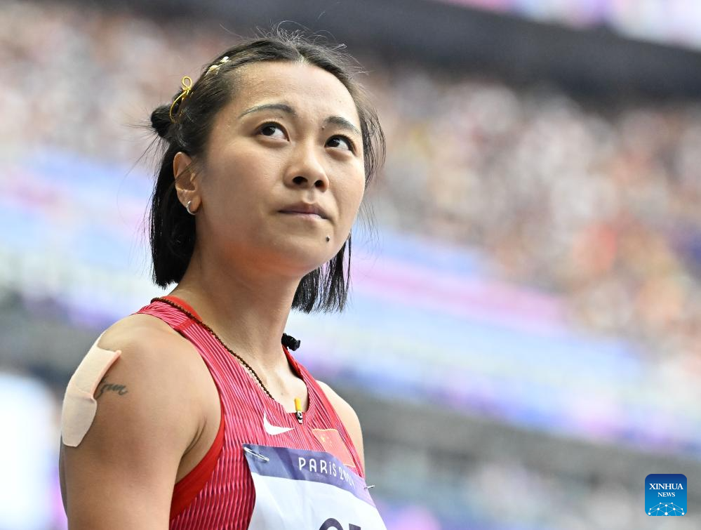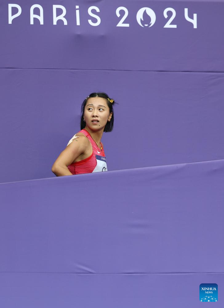 Ge Manqi of China reacts before the women's 100m round 1 of Athletics at the Paris 2024 Olympic Games in Paris, France, Aug. 2, 2024. (Xinhua/Song Yanhua)