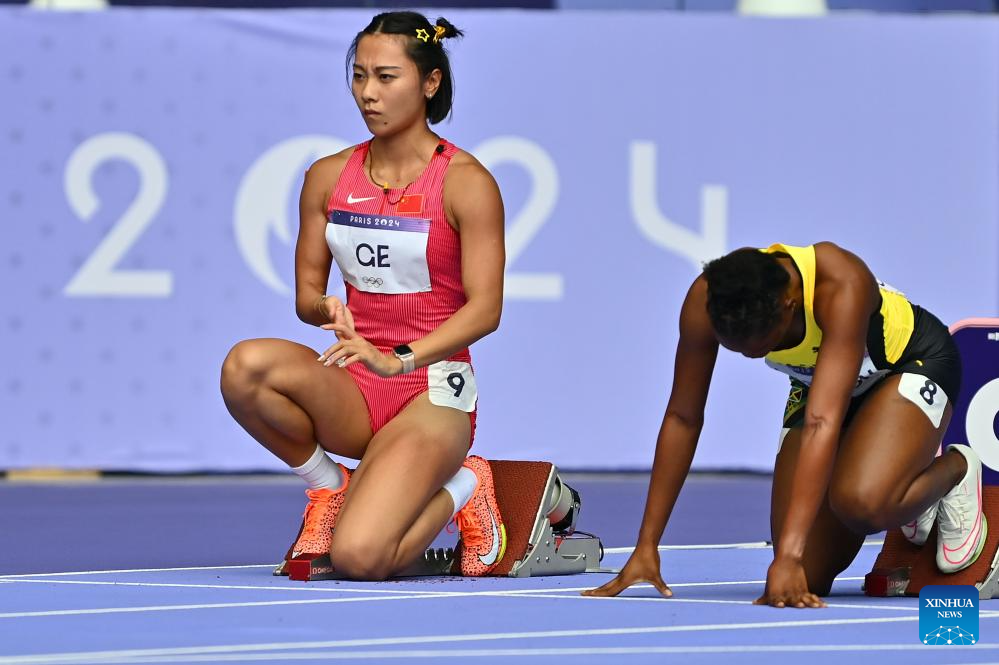 Ge Manqi (1st L) of China reacts before the women's 100m round 1 of Athletics at the Paris 2024 Olympic Games in Paris, France, Aug. 2, 2024. (Xinhua/Xu Chang)