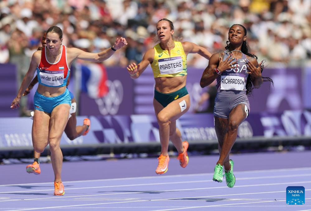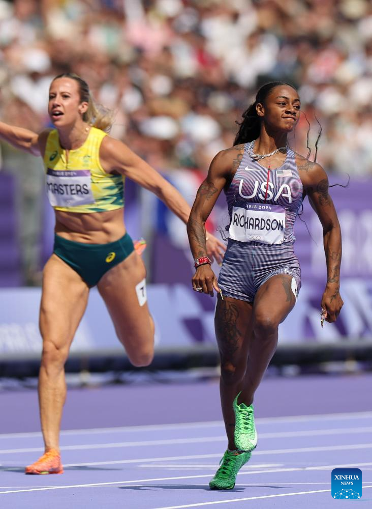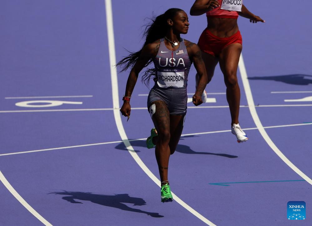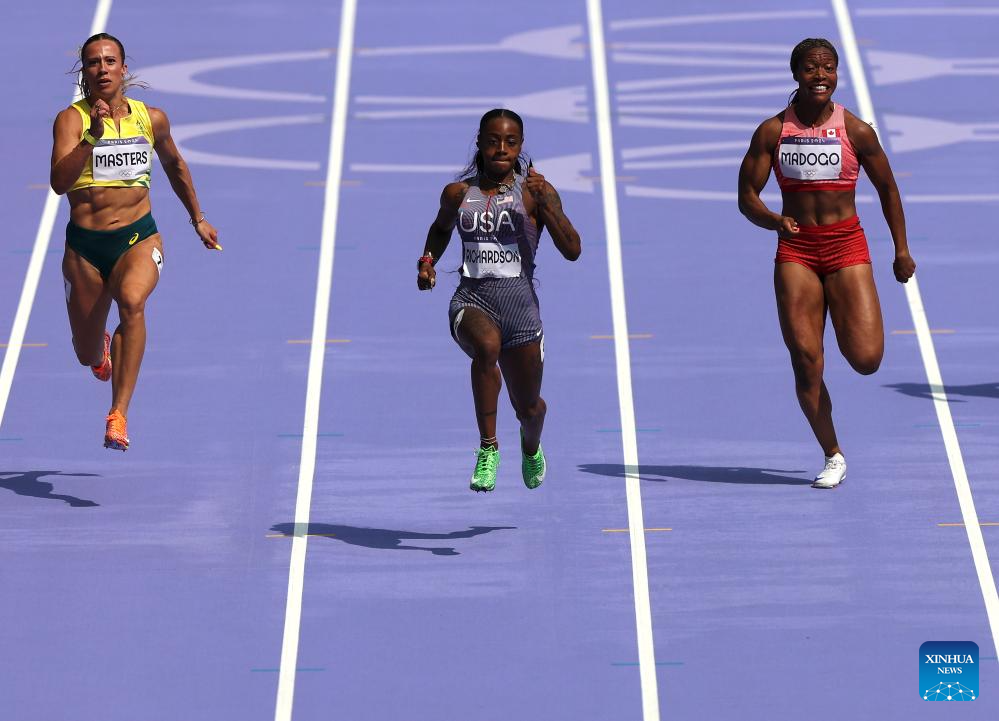 Sha'carri Richardson (C) of the United States competes during the women's 100m round 1 of Athletics at the Paris 2024 Olympic Games in Paris, France, Aug. 2, 2024. (Xinhua/Li Jing)