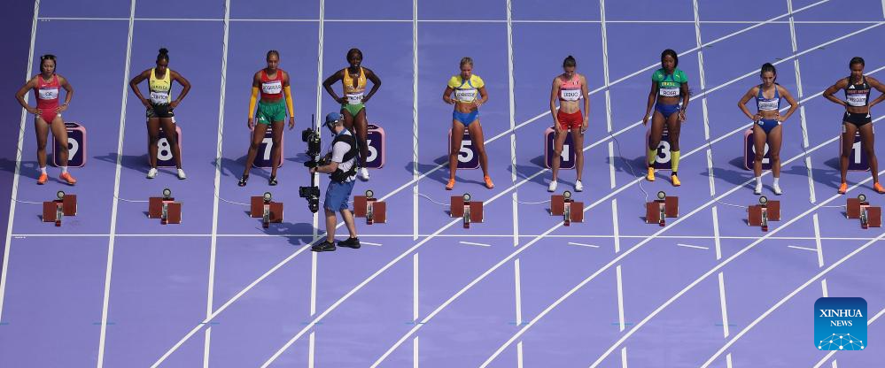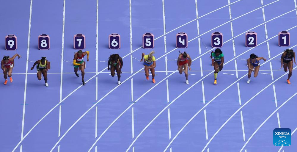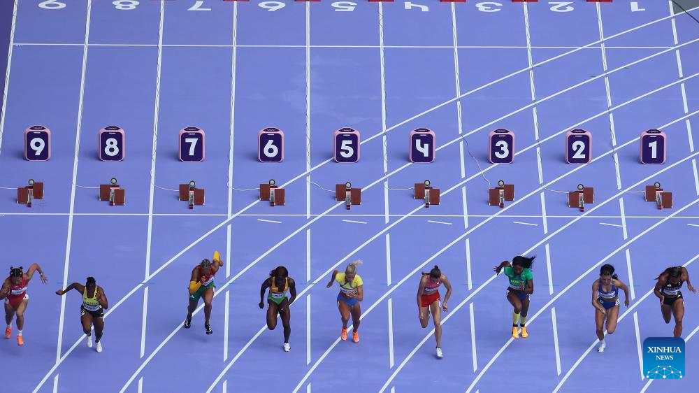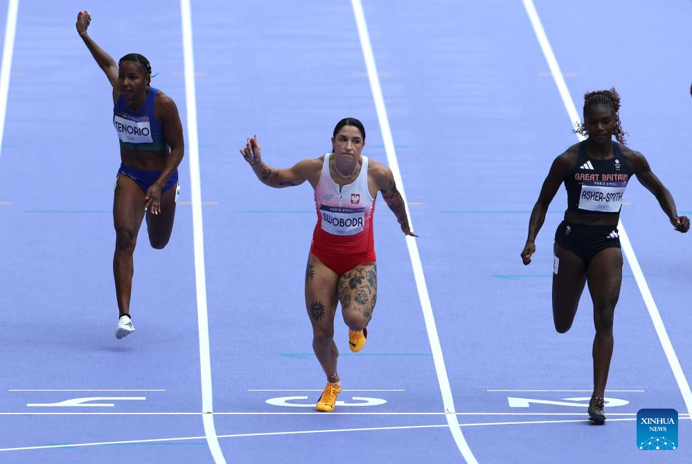 Ewa Swoboda (C) of Poland competes during the women's 100m round 1 of Athletics at the Paris 2024 Olympic Games in Paris, France, Aug. 2, 2024. (Xinhua/Li Jing)