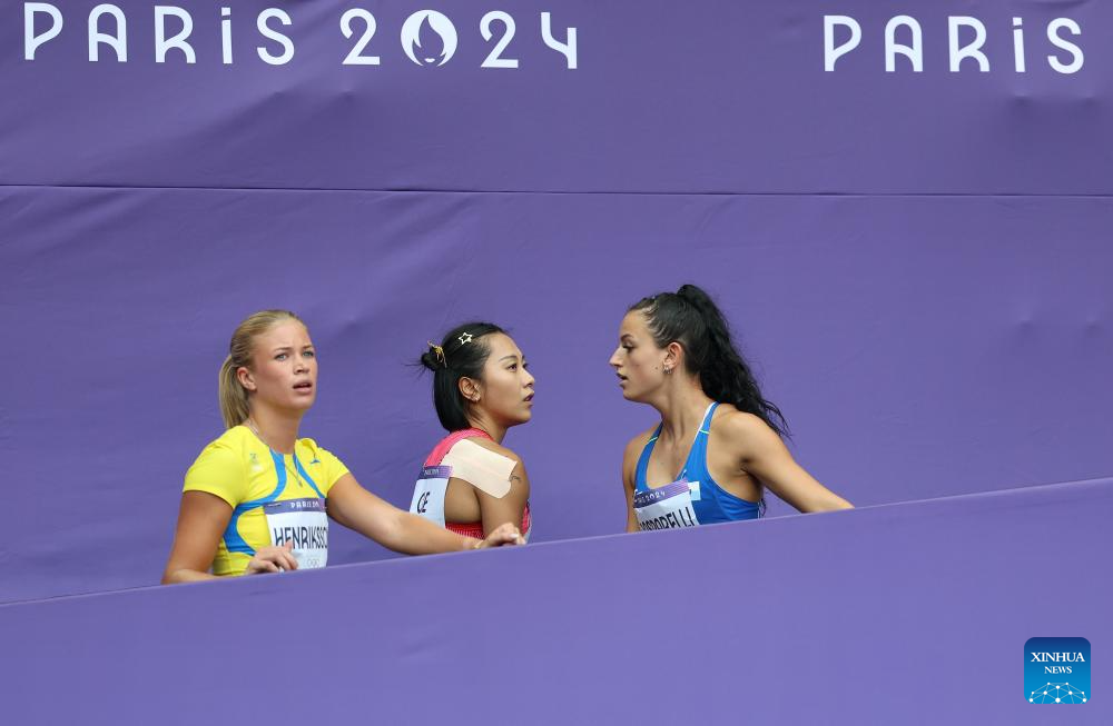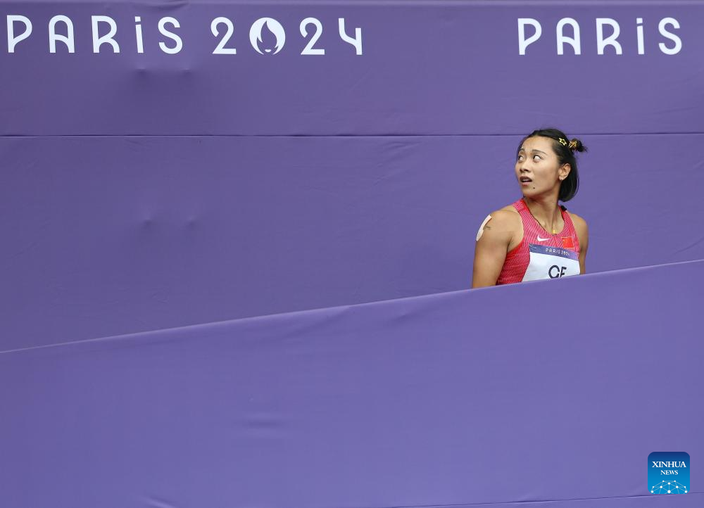 Ge Manqi (C) of China is seen after the women's 100m round 1 of Athletics at the Paris 2024 Olympic Games in Paris, France, Aug. 2, 2024. (Xinhua/Li Ming)