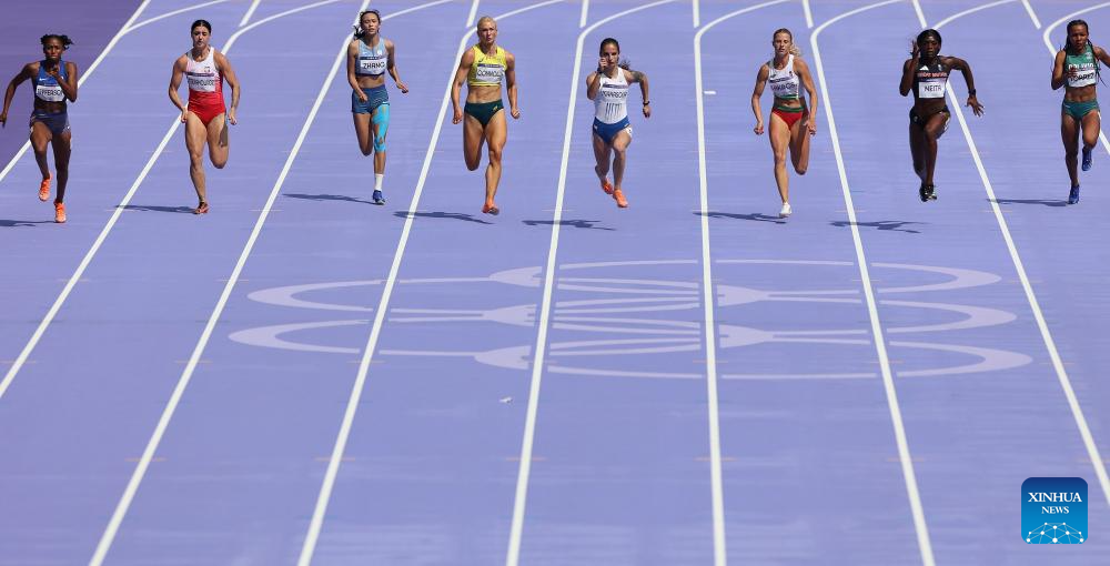 Ge Manqi (1st L) of China competes during the women's 100m round 1 of Athletics at the Paris 2024 Olympic Games in Paris, France, Aug. 2, 2024. (Xinhua/Xu Chang)