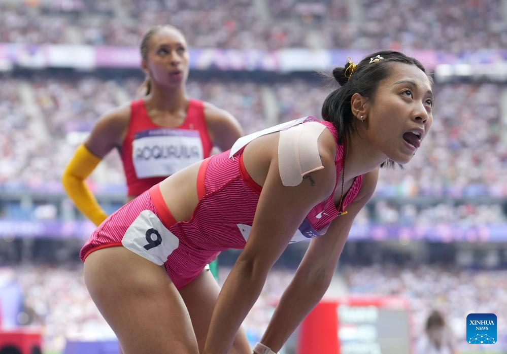 Ge Manqi (front) of China reacts after the women's 100m round 1 of Athletics at the Paris 2024 Olympic Games in Paris, France, Aug. 2, 2024. (Xinhua/Lui Siu Wai)