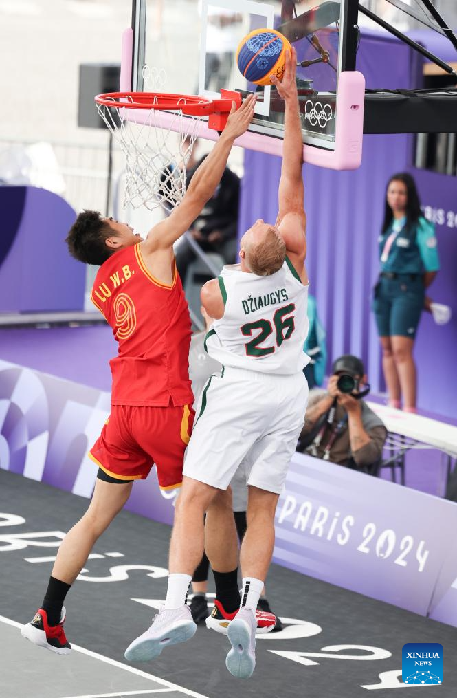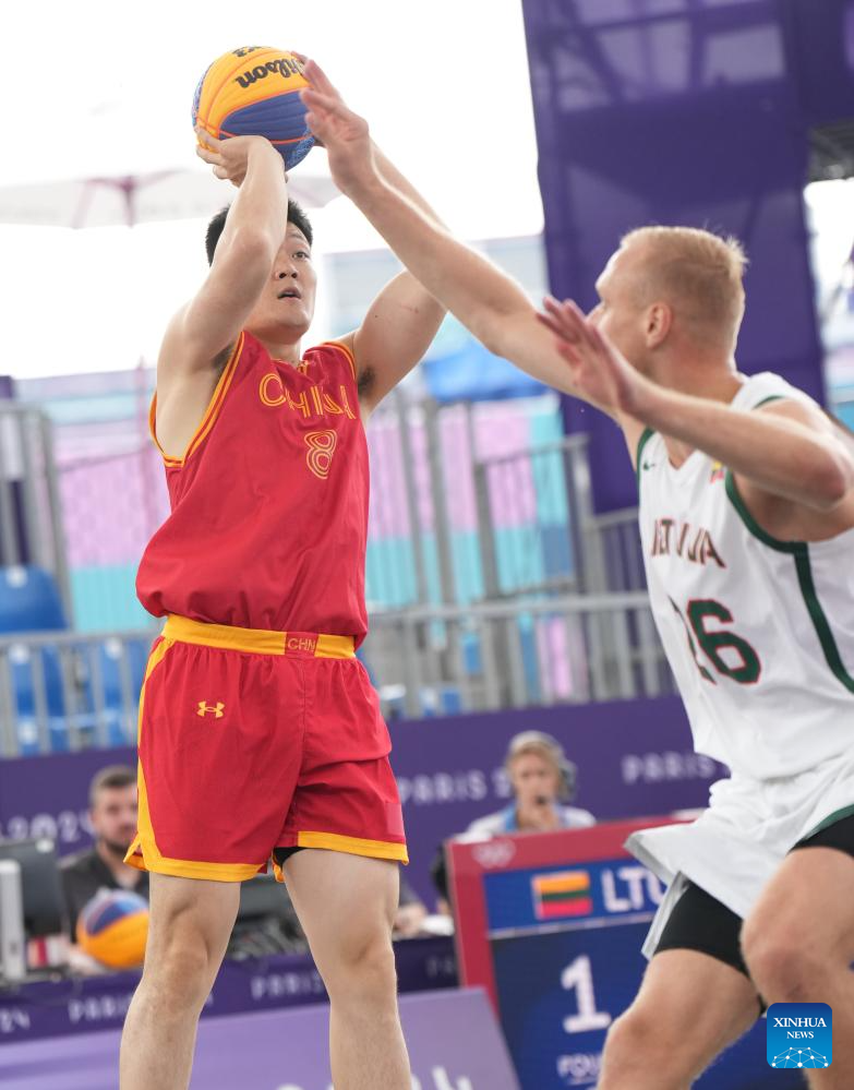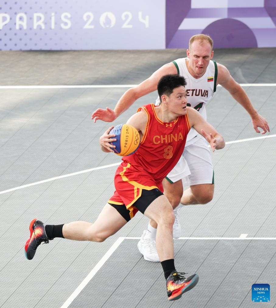 Lu Wenbo (R) of China competes during the 3x3 basketball men's pool round game between China and Lithuania at the Paris 2024 Olympic Games in Paris, France, on Aug. 2, 2024. (Xinhua/Meng Yongmin)