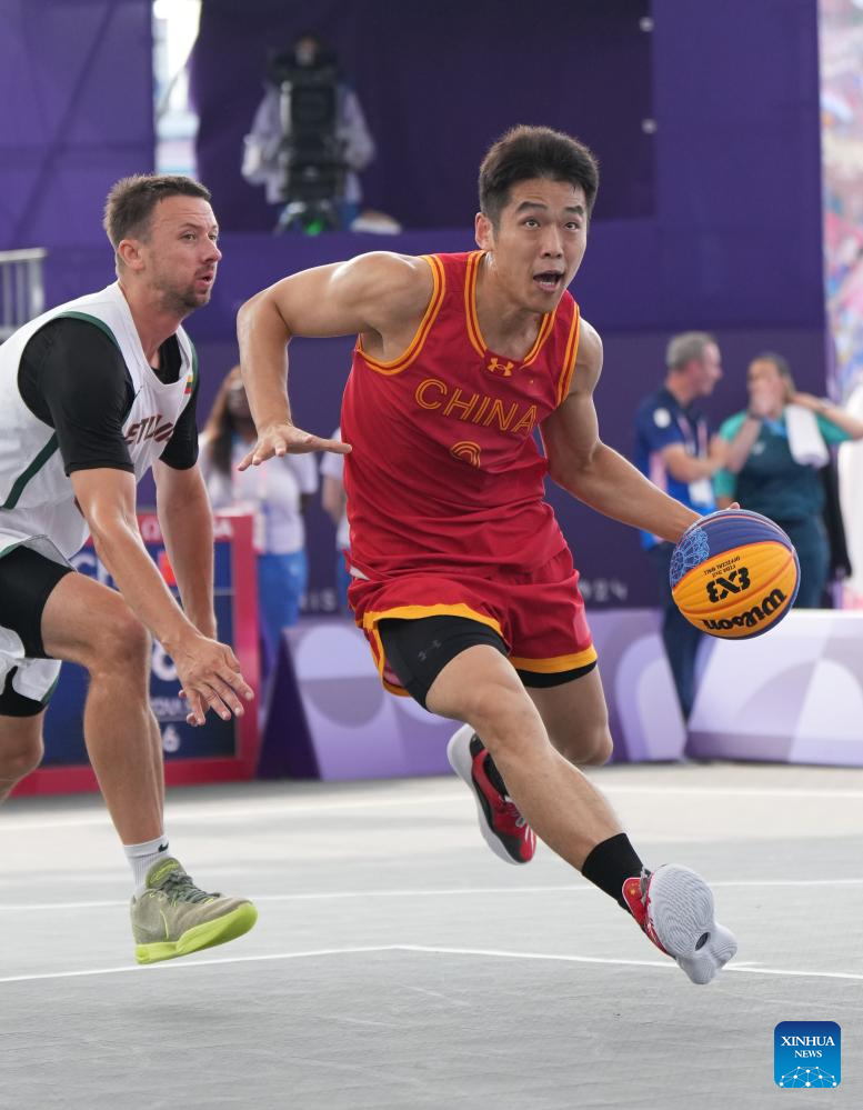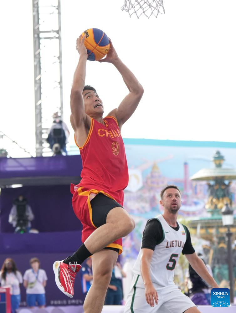 Lu Wenbo of China competes during the 3x3 basketball men's pool round game between China and Lithuania at the Paris 2024 Olympic Games in Paris, France, on Aug. 2, 2024. (Xinhua/Meng Yongmin)