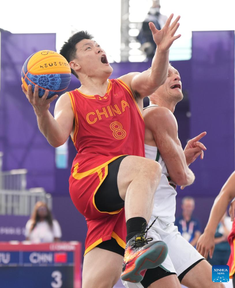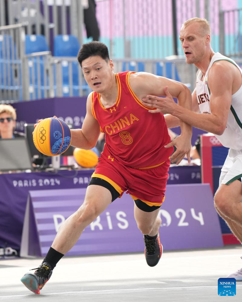 Zhang Ning (front) of China competes during the 3x3 basketball men's pool round game between China and Lithuania at the Paris 2024 Olympic Games in Paris, France, on Aug. 2, 2024. (Xinhua/Xu Yanan)