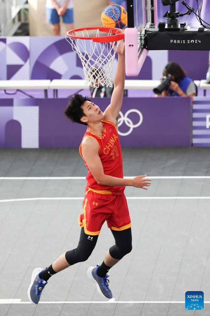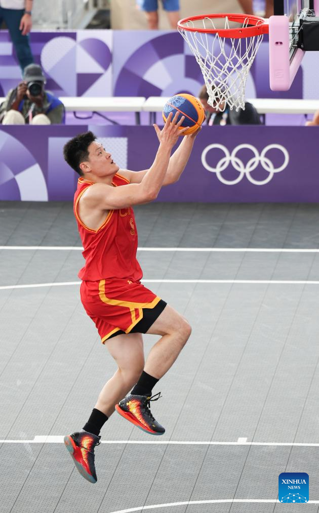Zhang Ning of China makes a layup during the 3x3 basketball men's pool round game between China and Lithuania at the Paris 2024 Olympic Games in Paris, France, on Aug. 2, 2024. (Xinhua/Xu Yanan)