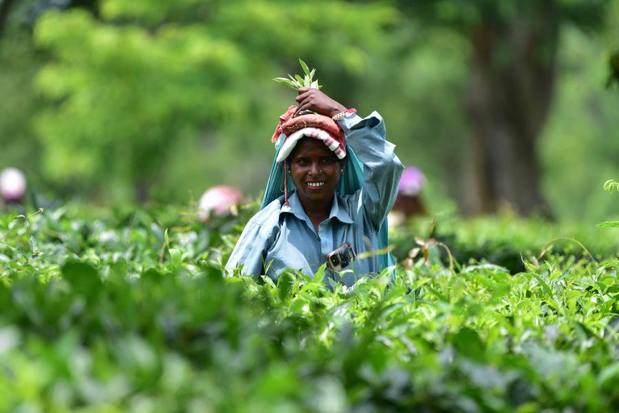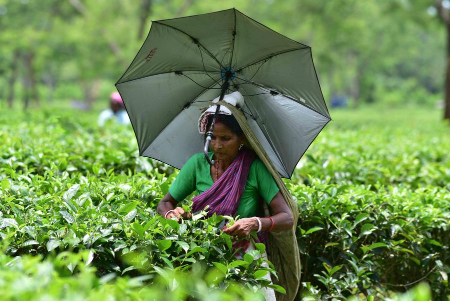 A worker picks tea leaves at a tea garden in Nagaon district of India's northeastern state of Assam, Aug. 1, 2024. (Str/Xinhua)