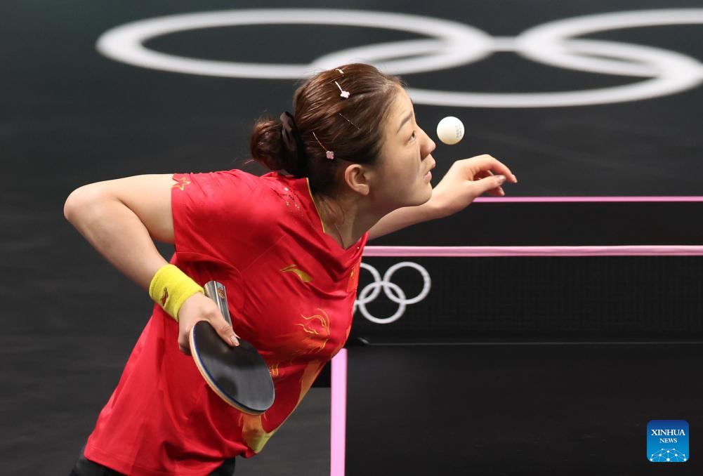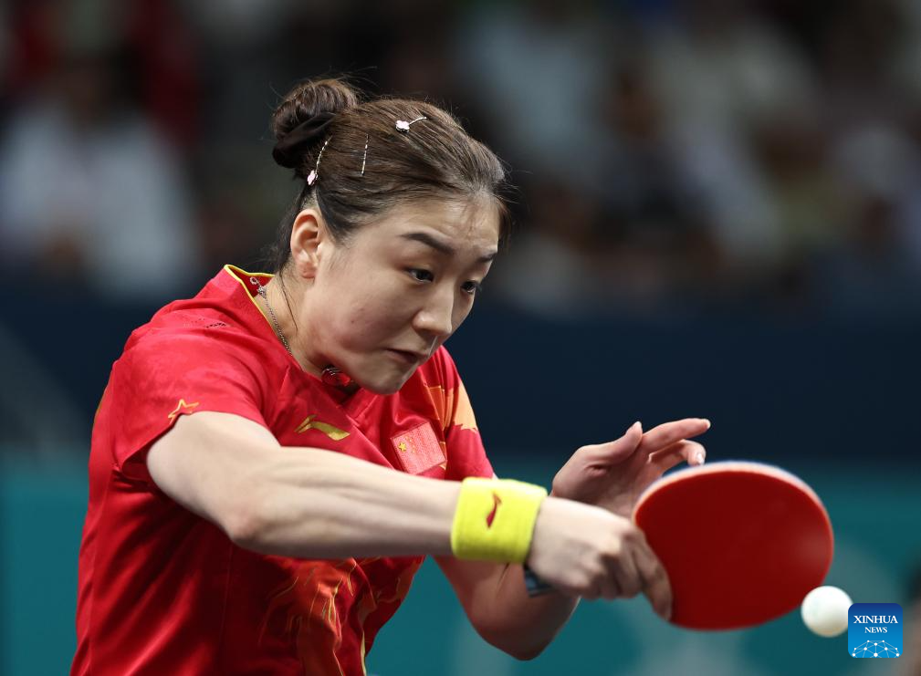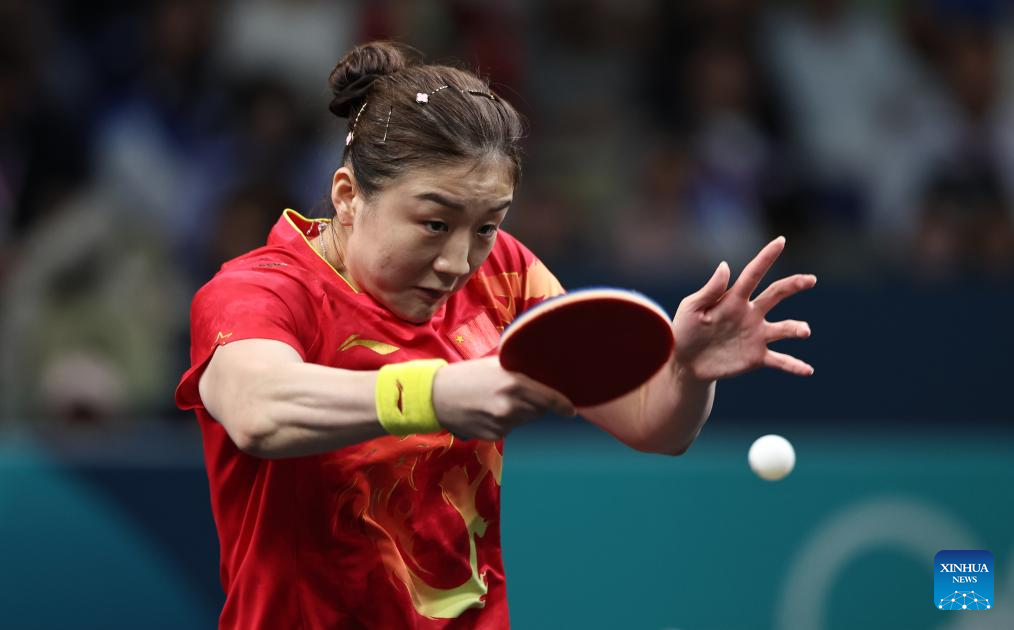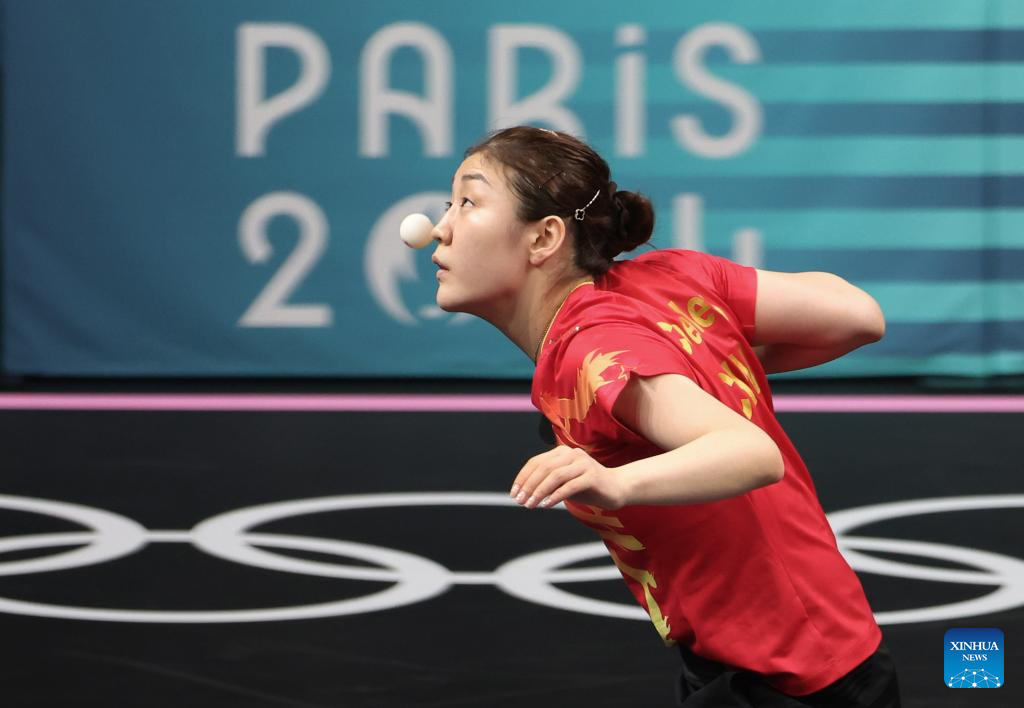 Chen Meng of China competes during the women's singles semifinal match of table tennis between Chen Meng of China and Shin Yubin of South Korea at the Paris 2024 Olympic Games in Paris, France, on Aug. 2, 2024. (Xinhua/Liu Xu)