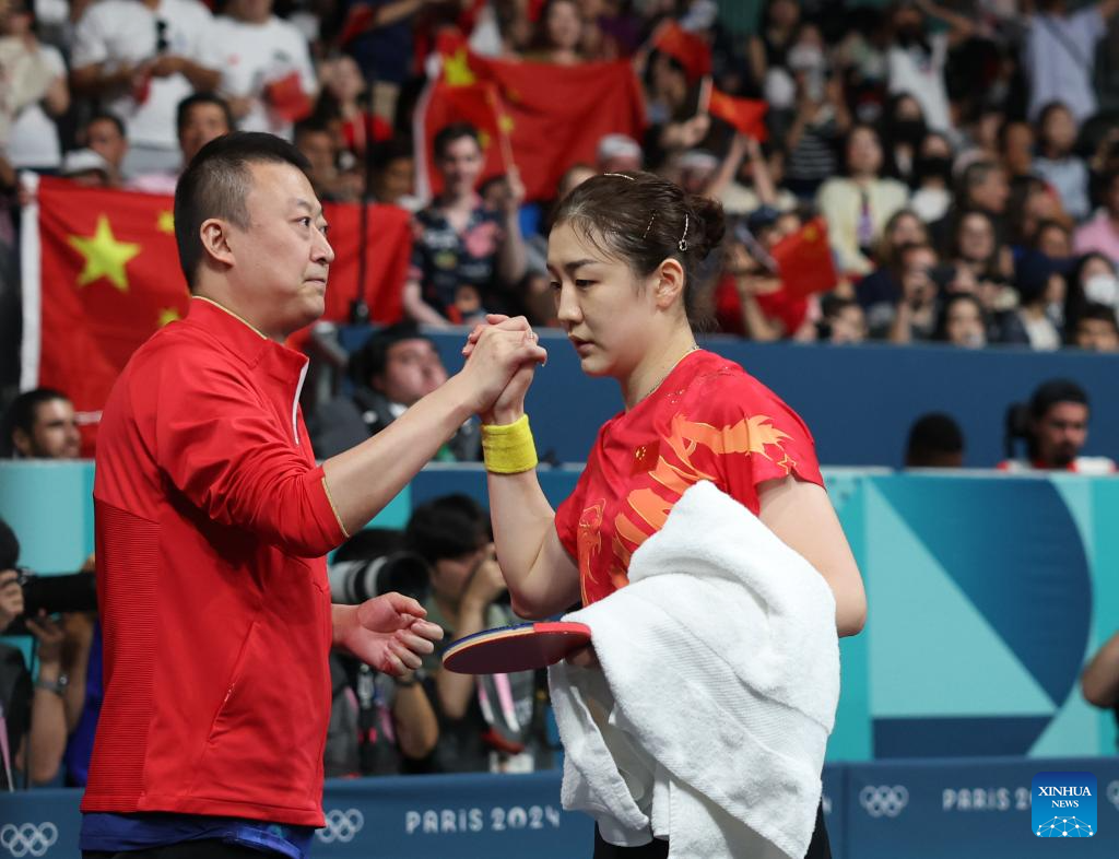 Chen Meng (R) of China clap hands with coach Ma Lin after the women's singles semifinal match of table tennis between Chen Meng of China and Shin Yubin of South Korea at the Paris 2024 Olympic Games in Paris, France, on Aug. 2, 2024. (Xinhua/Wang Dongzhen)