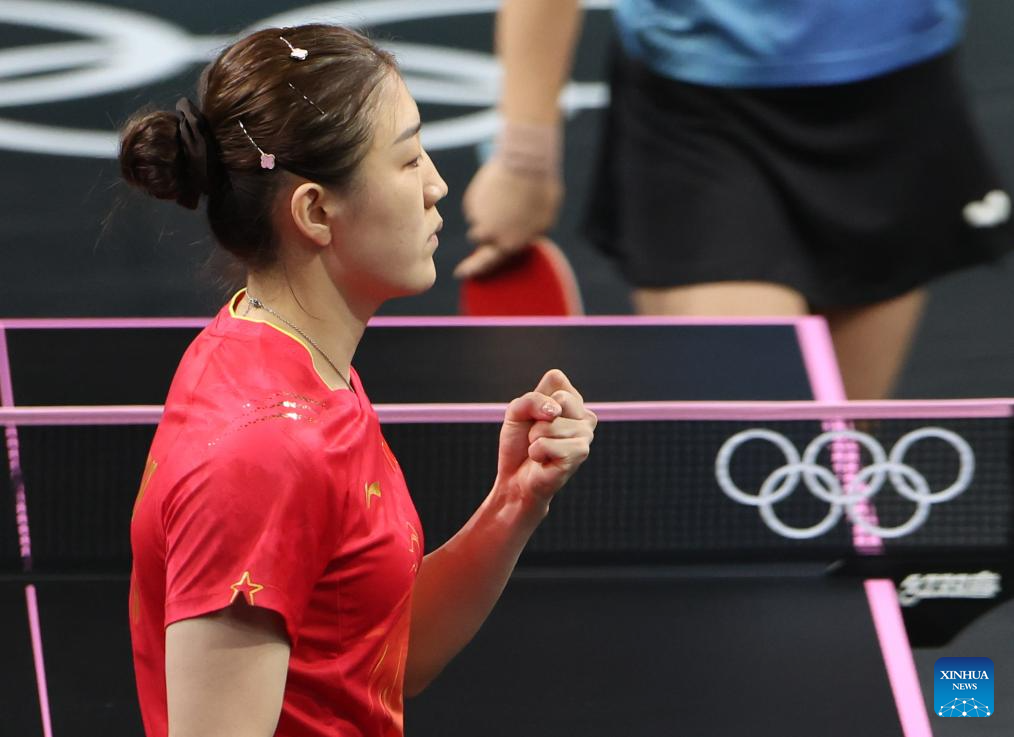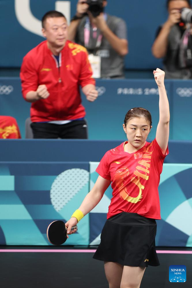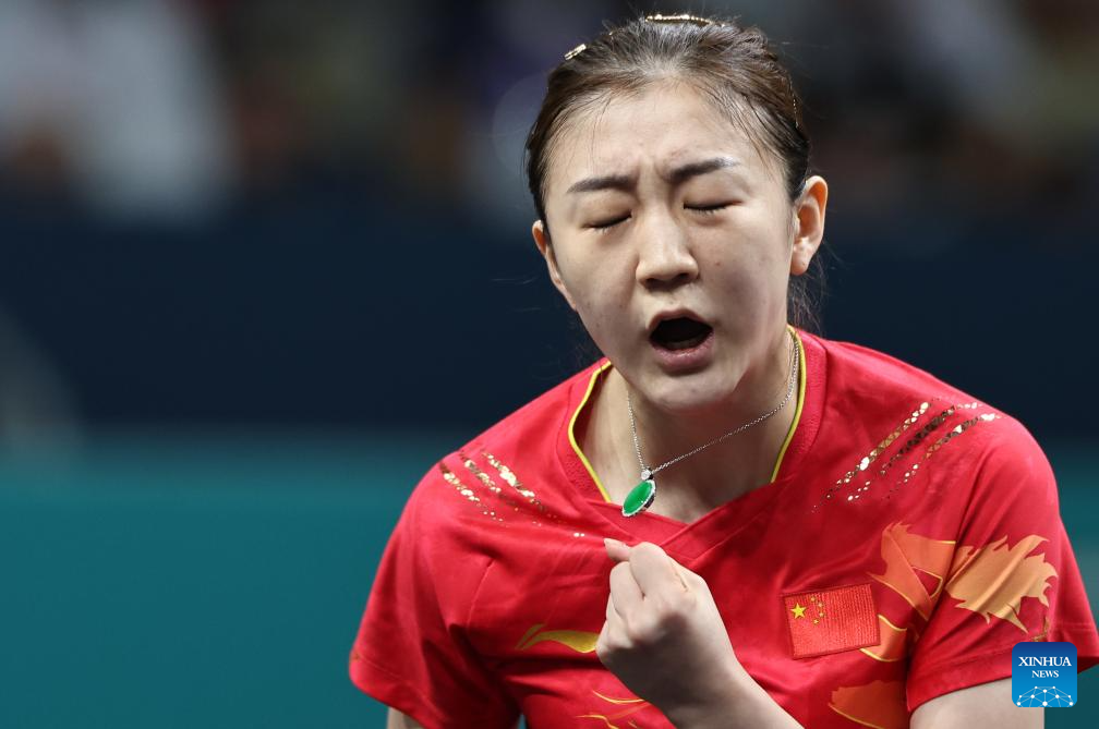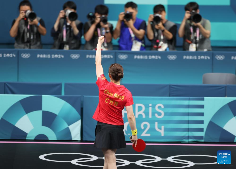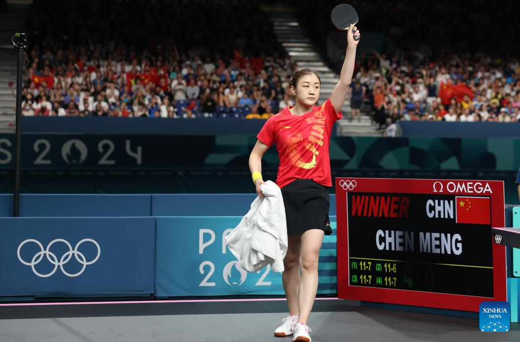 Chen Meng of China celebrates after the women's singles semifinal match of table tennis between Chen Meng of China and Shin Yubin of South Korea at the Paris 2024 Olympic Games in Paris, France, on Aug. 2, 2024. (Xinhua/Wang Dongzhen)