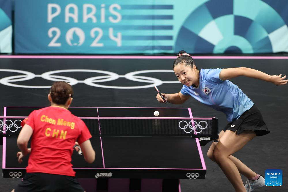 Shin Yubin (R) of South Korea competes during the women's singles semifinal match of table tennis between Chen Meng of China and Shin Yubin of South Korea at the Paris 2024 Olympic Games in Paris, France, on Aug. 2, 2024. (Xinhua/Liu Xu)