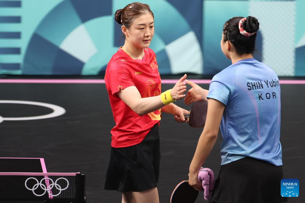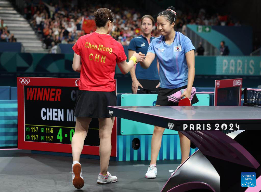 Chen Meng (L) of China claps hands with Shin Yubin of South Korea after the women's singles semifinal match of table tennis between Chen Meng of China and Shin Yubin of South Korea at the Paris 2024 Olympic Games in Paris, France, on Aug. 2, 2024. (Xinhua/Liu Xu)