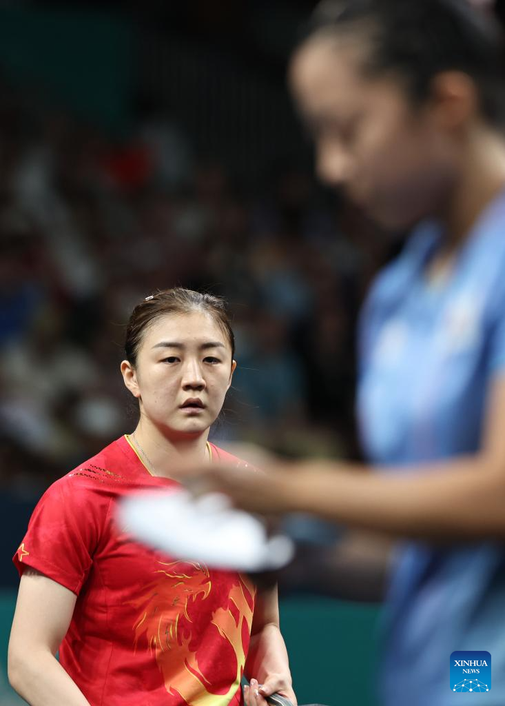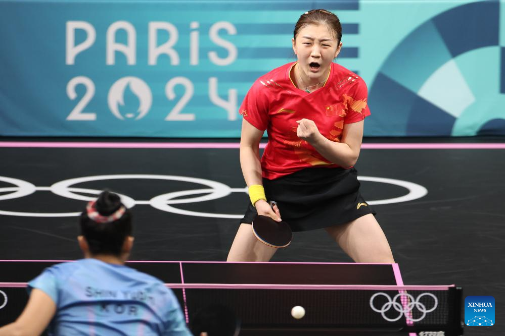 Chen Meng (top) of China reacts during the women's singles semifinal match of table tennis between Chen Meng of China and Shin Yubin of South Korea at the Paris 2024 Olympic Games in Paris, France, on Aug. 2, 2024. (Xinhua/Liu Xu)