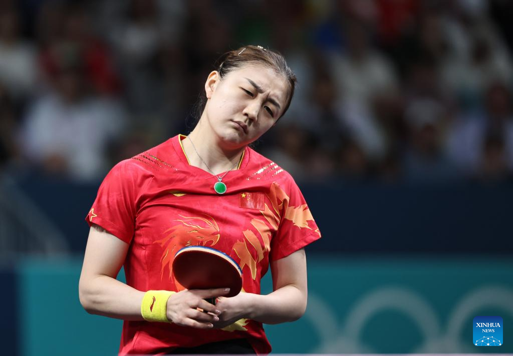 Chen Meng of China reacts during the women's singles semifinal match of table tennis between Chen Meng of China and Shin Yubin of South Korea at the Paris 2024 Olympic Games in Paris, France, on Aug. 2, 2024. (Xinhua/Wang Dongzhen)