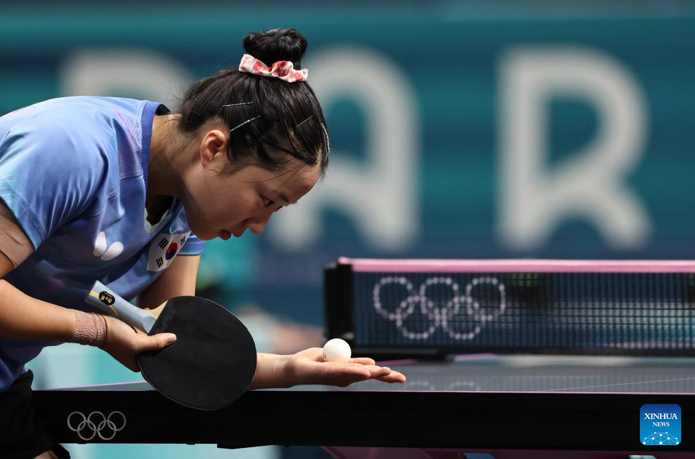 Shin Yubin of South Korea serves during the women's singles semifinal match of table tennis between Chen Meng of China and Shin Yubin of South Korea at the Paris 2024 Olympic Games in Paris, France, on Aug. 2, 2024. (Xinhua/Wang Dongzhen)