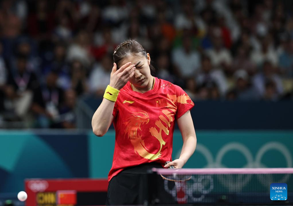 Chen Meng of China reacts during the women's singles semifinal match of table tennis between Chen Meng of China and Shin Yubin of South Korea at the Paris 2024 Olympic Games in Paris, France, on Aug. 2, 2024. (Xinhua/Liu Xu)