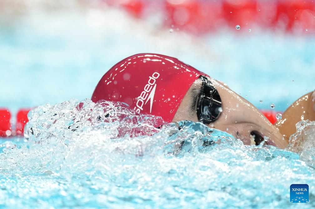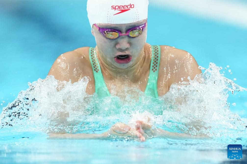 Yu Yiting of Team China competes during the women's 4x100m medley relay heats of swimming at the Paris 2024 Olympic Games in Paris, France, on Aug. 3, 2024. (Xinhua/Xue Yuge)