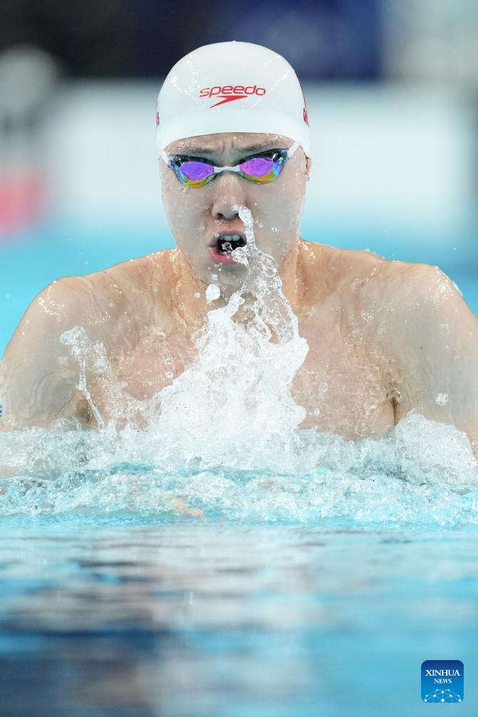 Qin Haiyang of Team China competes during the men's 4x100m medley relay heats of swimming at the Paris 2024 Olympic Games in Paris, France, on Aug. 3, 2024. (Xinhua/Xue Yuge)