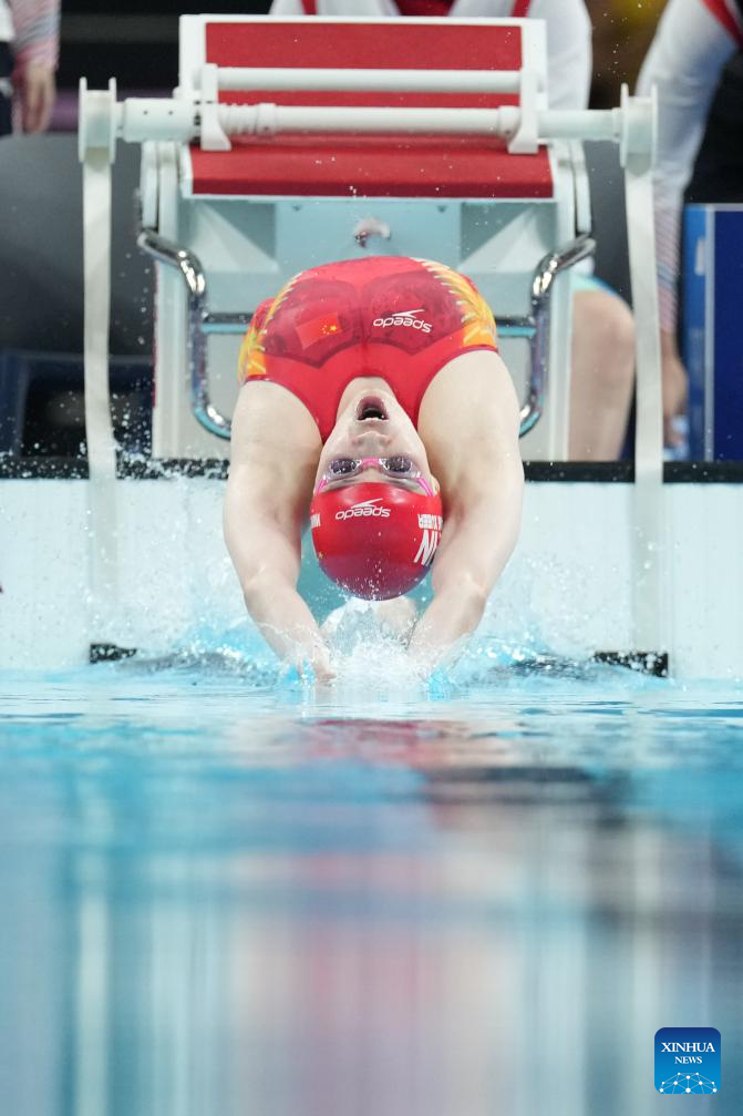 Wang Xueer of China competes during the women's 4x100m medley relay heats of swimming at the Paris 2024 Olympic Games in Paris, France, on Aug. 3, 2024. (Xinhua/Xue Yuge)