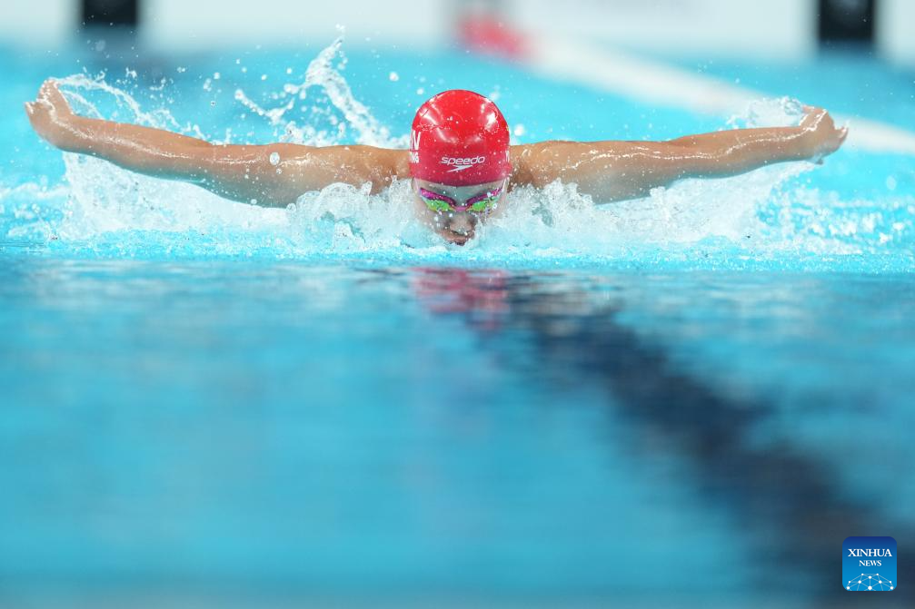 Tang Qianting of Team China competes during the women's 4x100m medley relay heats of swimming at the Paris 2024 Olympic Games in Paris, France, on Aug. 3, 2024. (Xinhua/Xue Yuge)