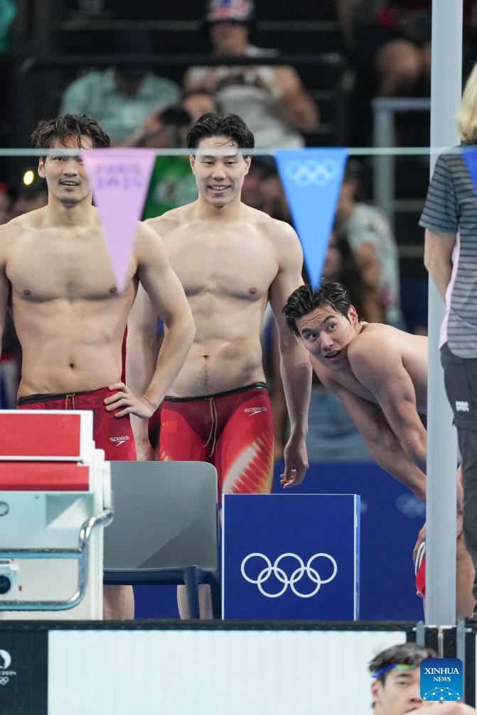 Xu Jiayu, Qin Haiyang, Wang Changhao and Pan Zhanlei (L to R) of China react during the men's 4x100m medley relay heats of swimming at the Paris 2024 Olympic Games in Paris, France, on Aug. 3, 2024. (Xinhua/Xue Yuge)