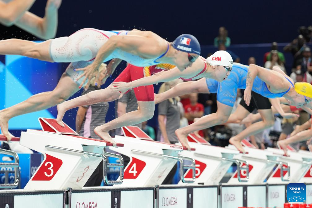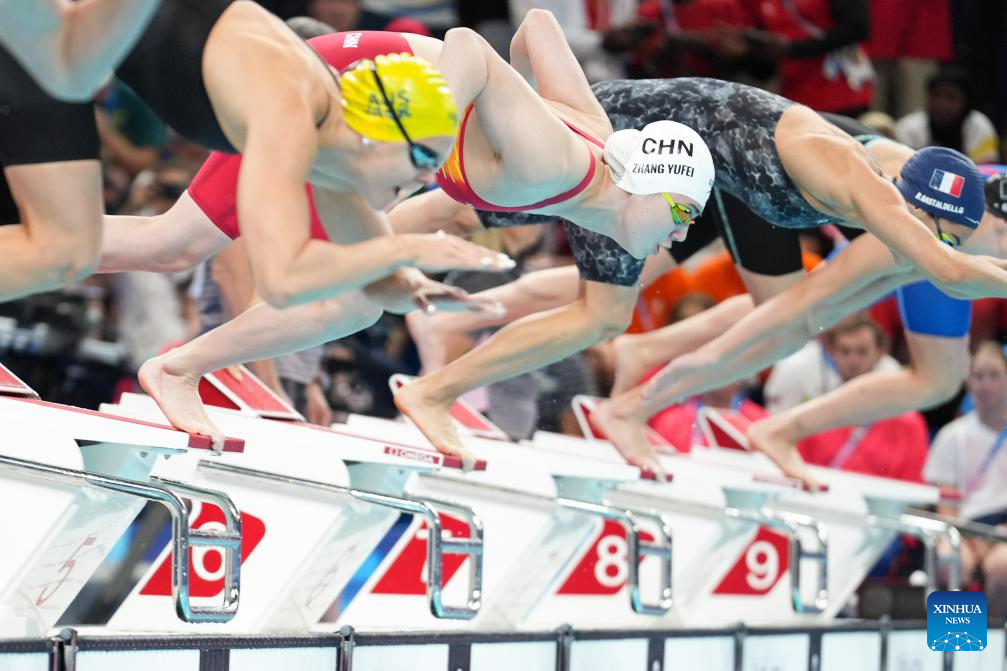 Zhang Yufei (2nd L) of China competes during the women's 50m freestyle heats of swimming at the Paris 2024 Olympic Games in Paris, France, on Aug. 3, 2024. (Xinhua/Xue Yuge)