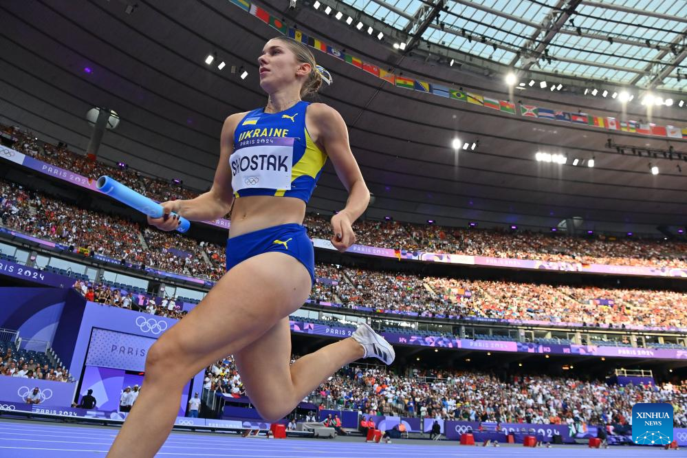 Maryana Shostak of team Ukraine competes during the 4x400m relay mixed round 1 of Athletics at the Paris 2024 Olympic Games in Paris, France, Aug. 2, 2024. (Xinhua/Song Yanhua)