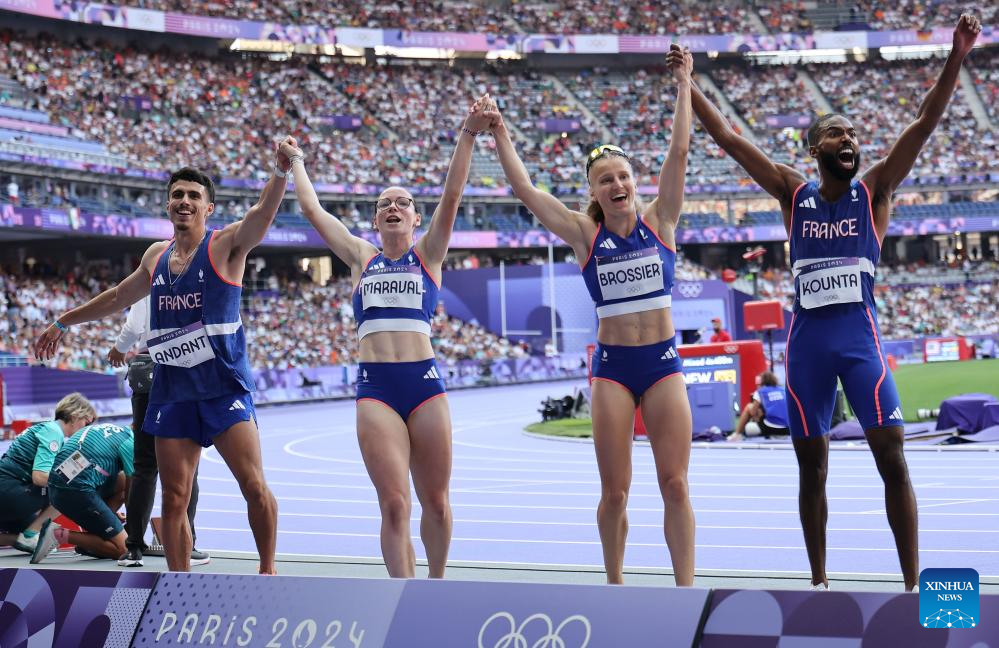 Team France celebrate the 4x400m relay mixed round 1 of Athletics at the Paris 2024 Olympic Games in Paris, France, Aug. 2, 2024. (Xinhua/Li Gang)