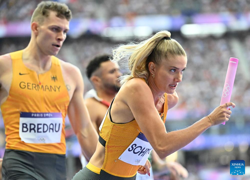 Alica Schmidt (R) of team Germany competes during the 4x400m relay mixed round 1 of Athletics at the Paris 2024 Olympic Games in Paris, France, Aug. 2, 2024. (Xinhua/Lui Siu Wai)