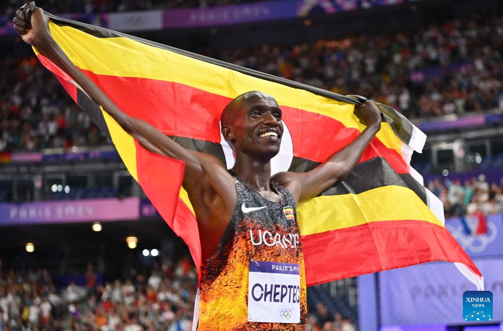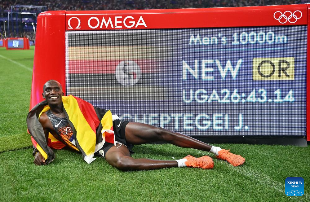 Joshua Cheptegei of Uganda celebrates after the men's 10000m final of athletics at the Paris 2024 Olympic Games in Paris, France, Aug. 2, 2024. (Xinhua/Li Ming)