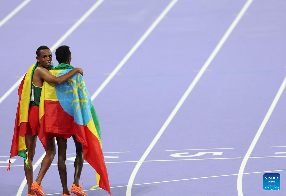 Berihu Aregawi (L) and Selemon Barega of Ethiopia react after the men's 10000m final of athletics at the Paris 2024 Olympic Games in Paris, France, Aug. 2, 2024. (Xinhua/Li Jing)
