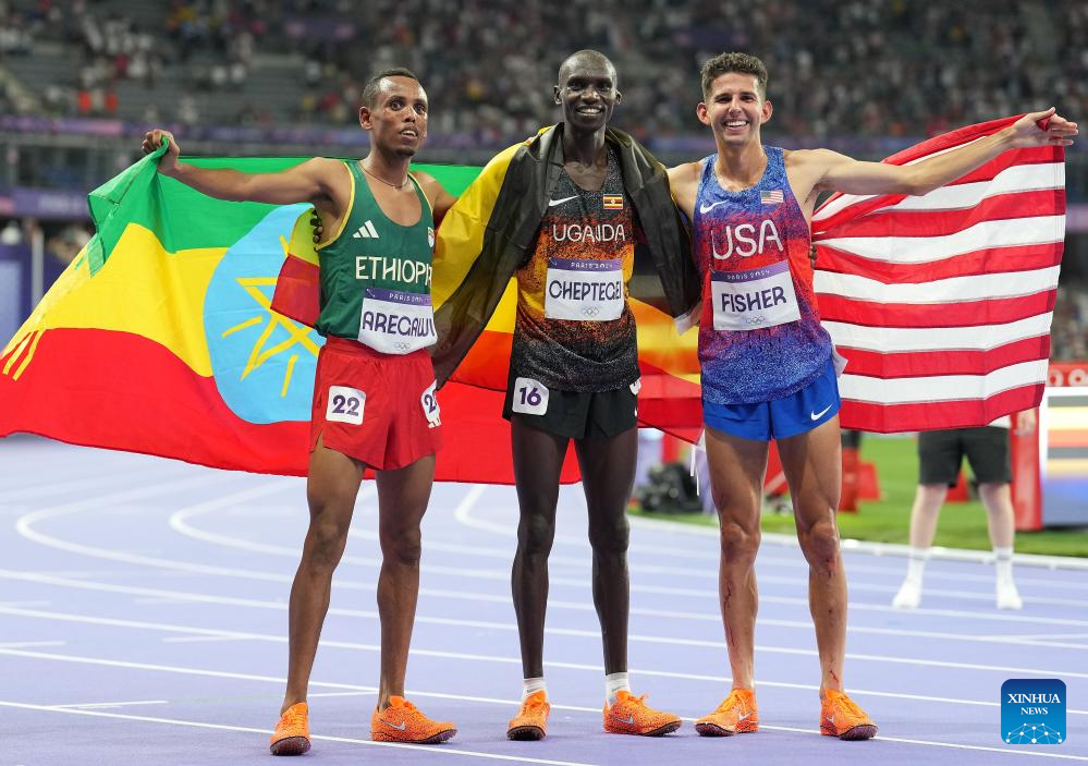 Grant Fisher of the United States celebrate after the men's 10000m final of athletics at the Paris 2024 Olympic Games in Paris, France, Aug. 2, 2024. (Xinhua/Lui Siu Wai)