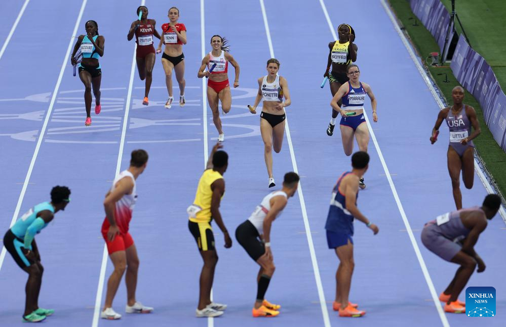 Athletes compete during the 4x400m relay mixed round 1 of Athletics at the Paris 2024 Olympic Games in Paris, France, Aug. 2, 2024. (Xinhua/Li Jing)