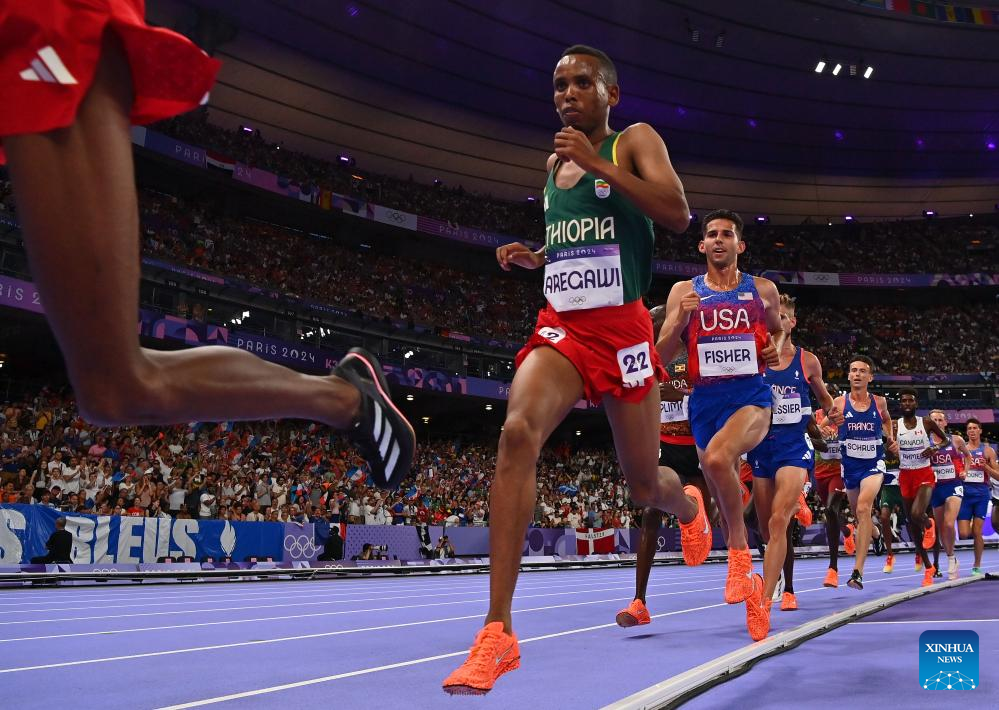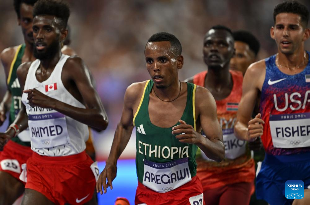 Berihu Aregawi (front) of Ethiopia competes during the men's 10000m final of athletics at the Paris 2024 Olympic Games in Paris, France, Aug. 2, 2024. (Xinhua/Song Yanhua)