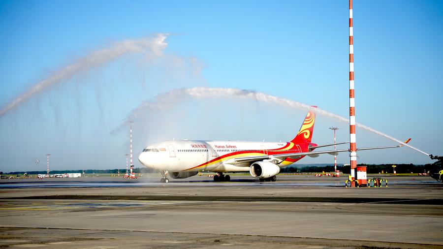 A passenger plane of Hainan Airlines receives a ceremonial water salute upon its arrival at the Prague Airport in Prague, the Czech Republic, June 24, 2024. (Photo by Dana Kesnerova/Xinhua)
