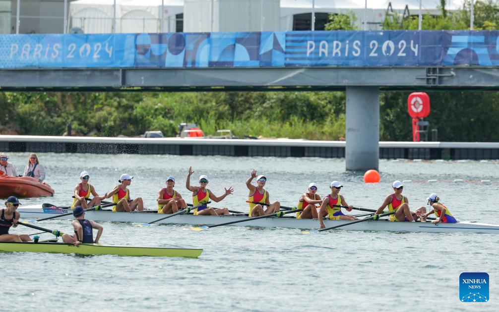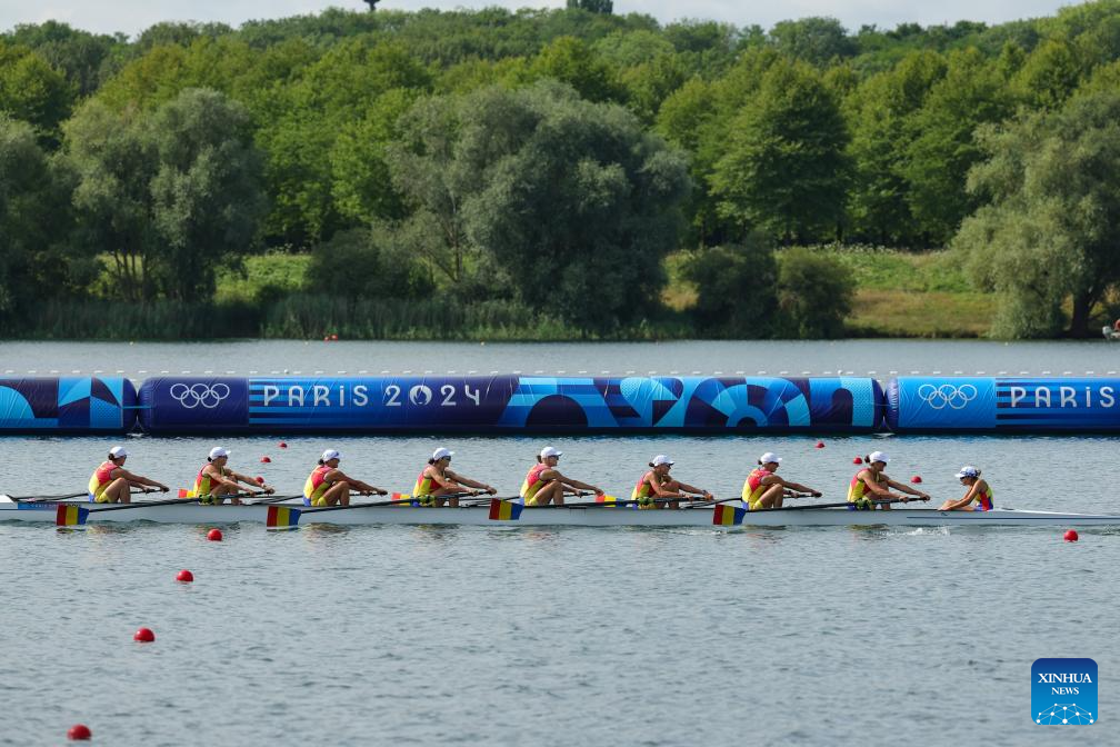 Athletes of team Romania compete during the women's eight final A of rowing at the Paris 2024 Olympic Games in Vaires-sur-Marne, France, on Aug. 3, 2024. (Xinhua/Shen Bohan)