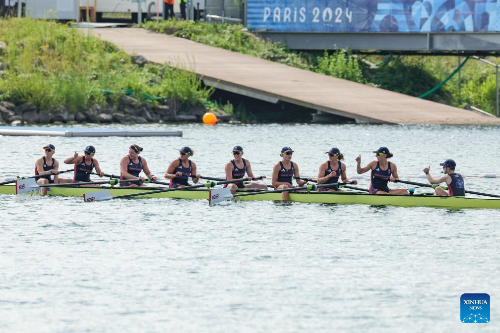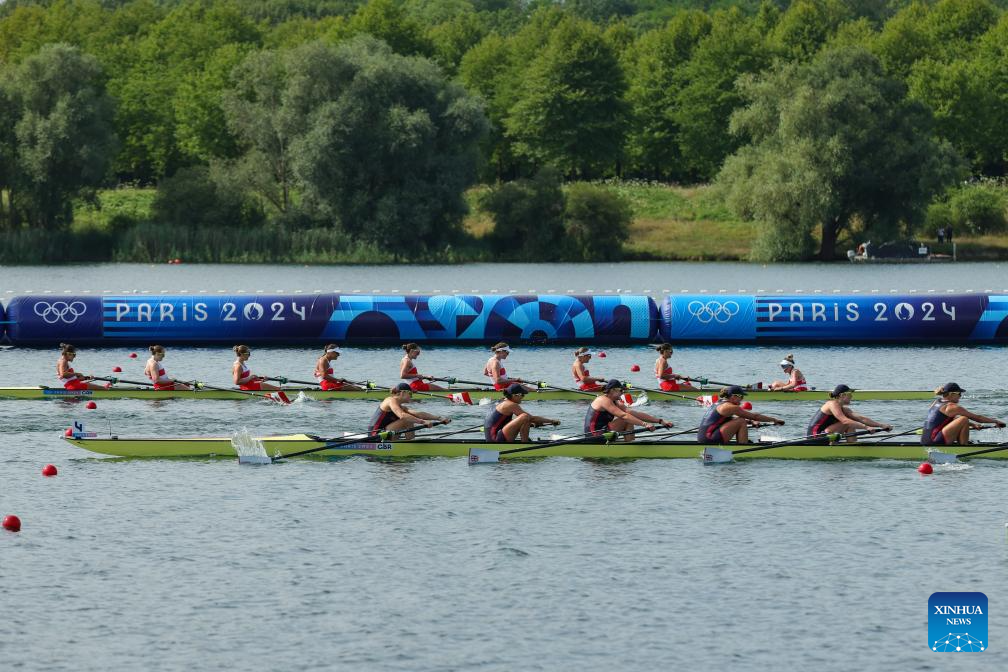 Athletes compete during the women's eight final A of rowing at the Paris 2024 Olympic Games in Vaires-sur-Marne, France, on Aug. 3, 2024. (Xinhua/Shen Bohan)