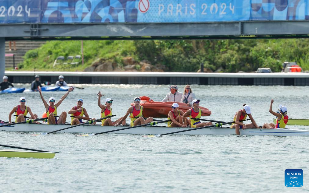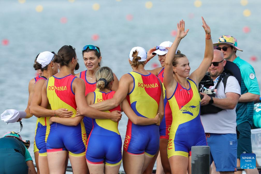Athletes of team Romania react after the women's eight final A of rowing at the Paris 2024 Olympic Games in Vaires-sur-Marne, France, on Aug. 3, 2024. (Xinhua/Shen Bohan)