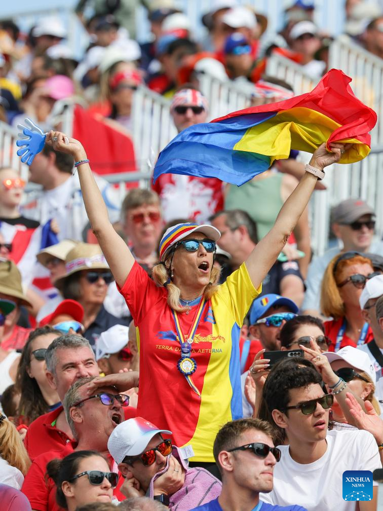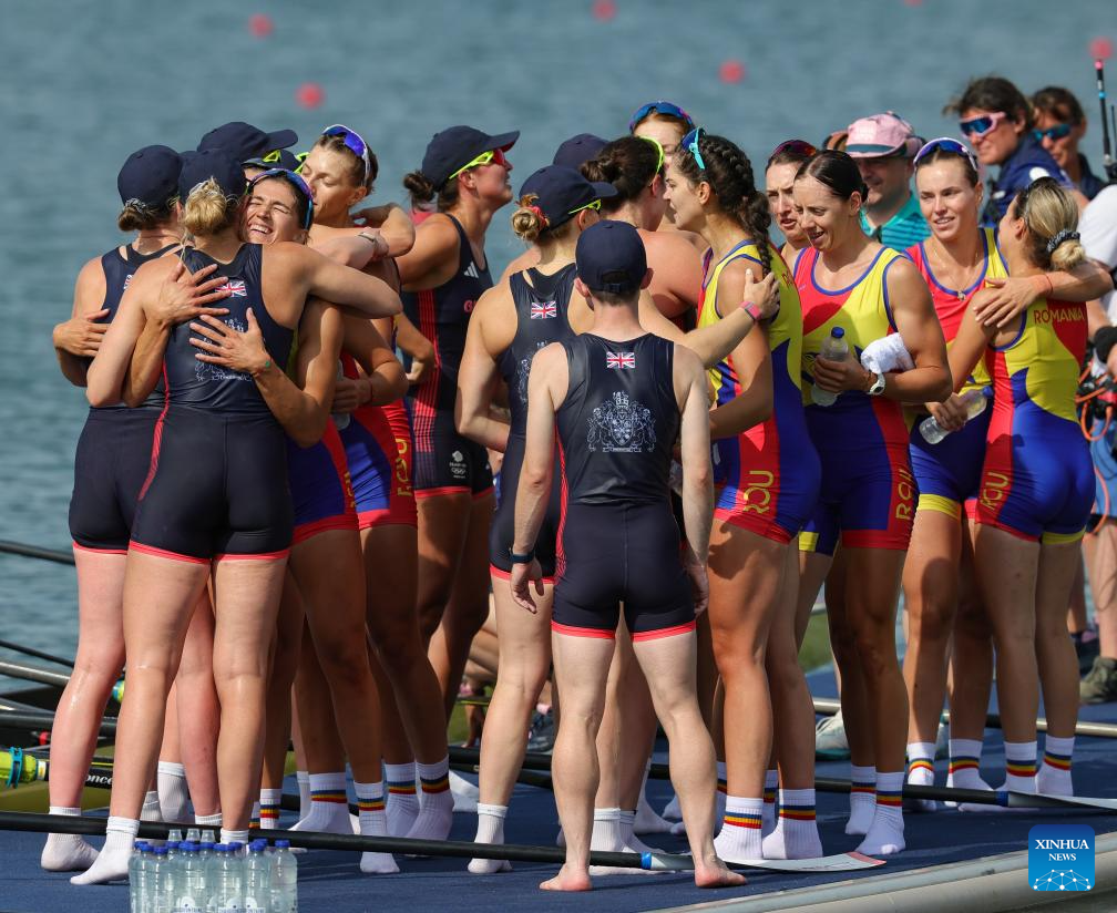 Athletes of team Romania and team Great Britain react after the women's eight final A of rowing at the Paris 2024 Olympic Games in Vaires-sur-Marne, France, on Aug. 3, 2024. (Xinhua/Shen Bohan)
