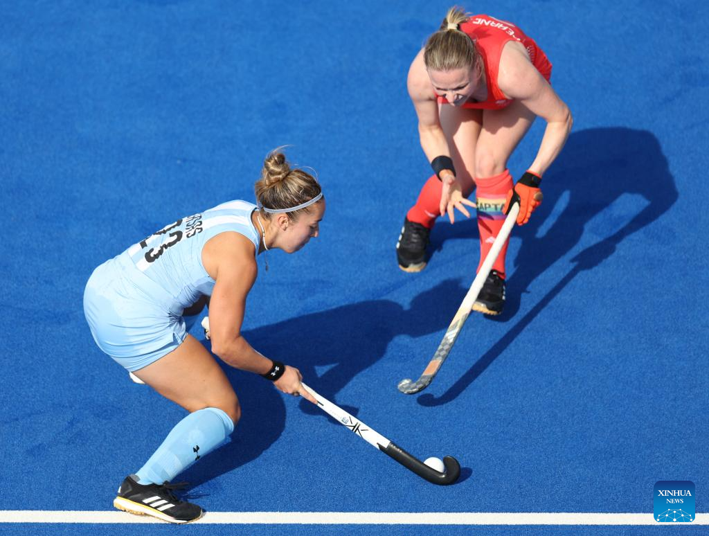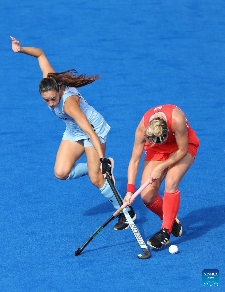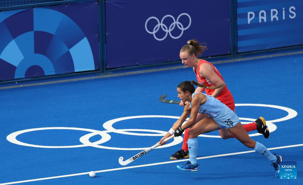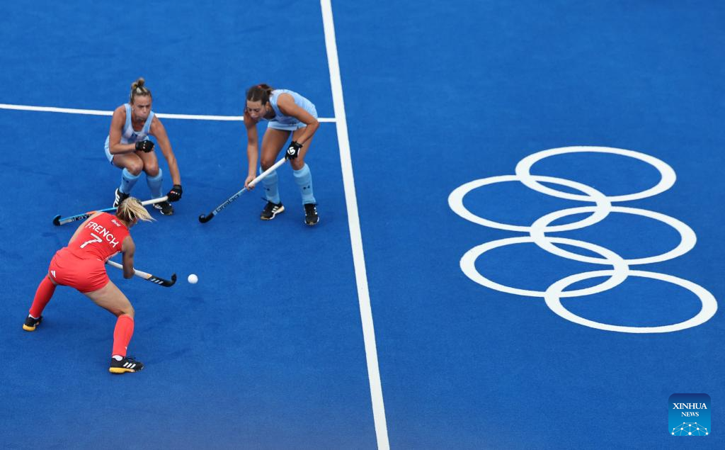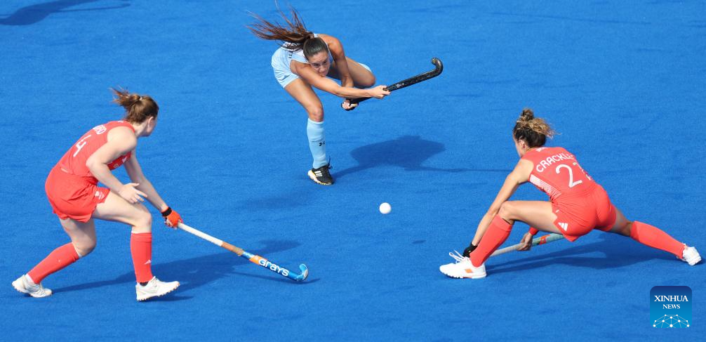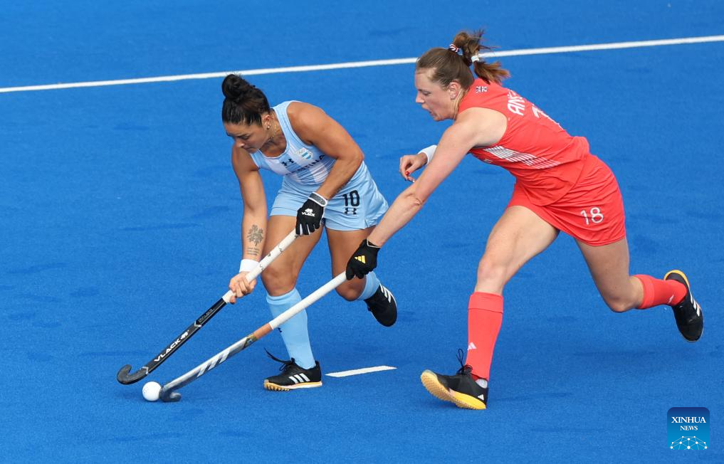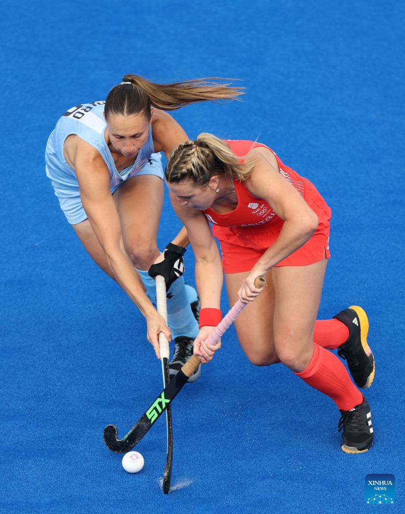 Players compete during the women's pool B match of hockey between Great Britain and Argentina in Colombes, northwest suburbs of Paris, France, Aug. 3, 2024. (Xinhua/Ren Pengfei)