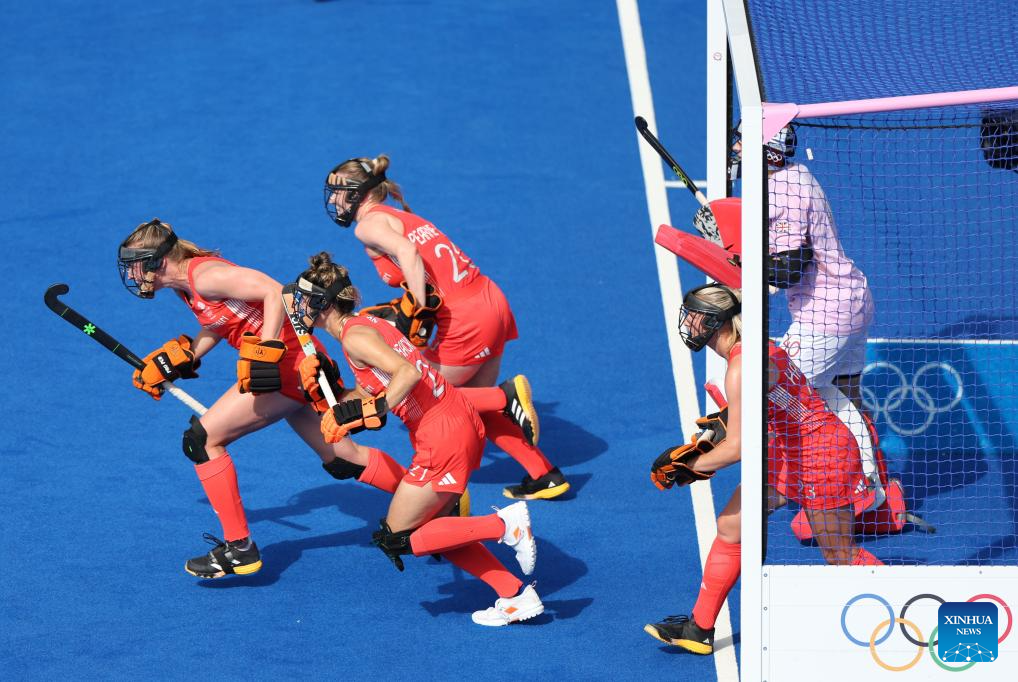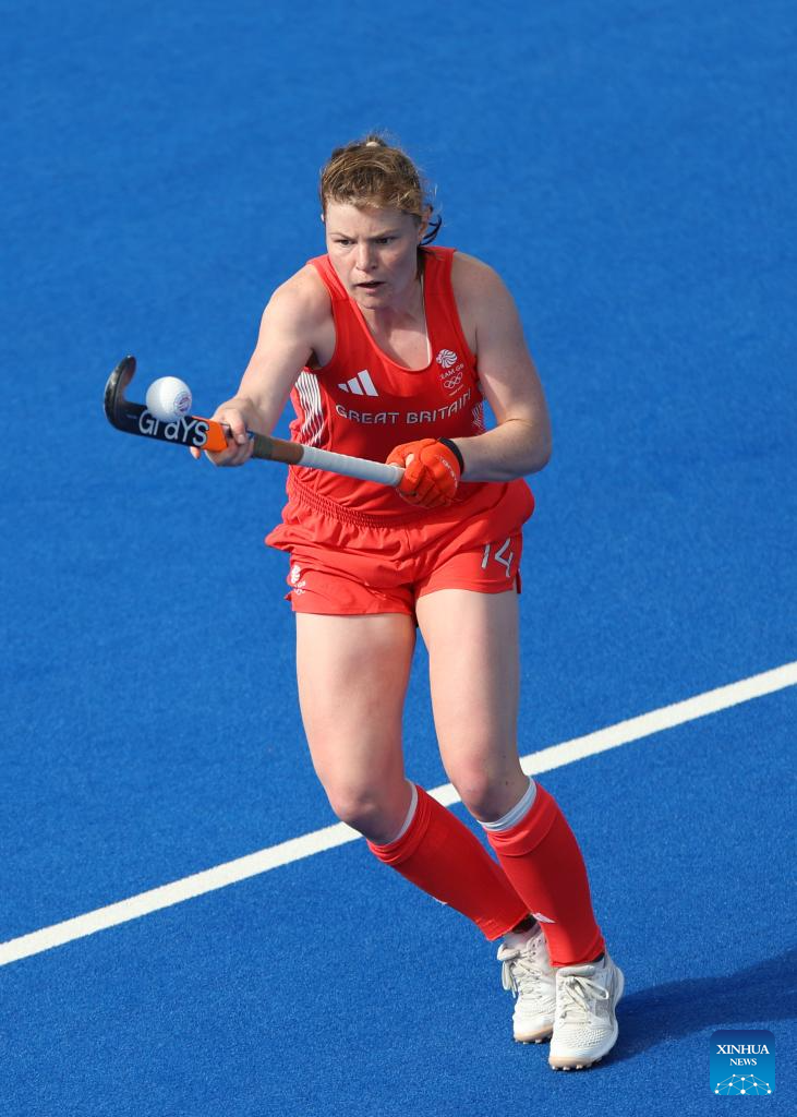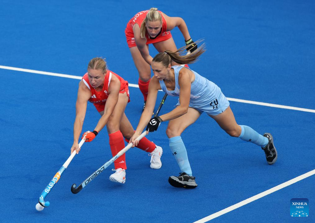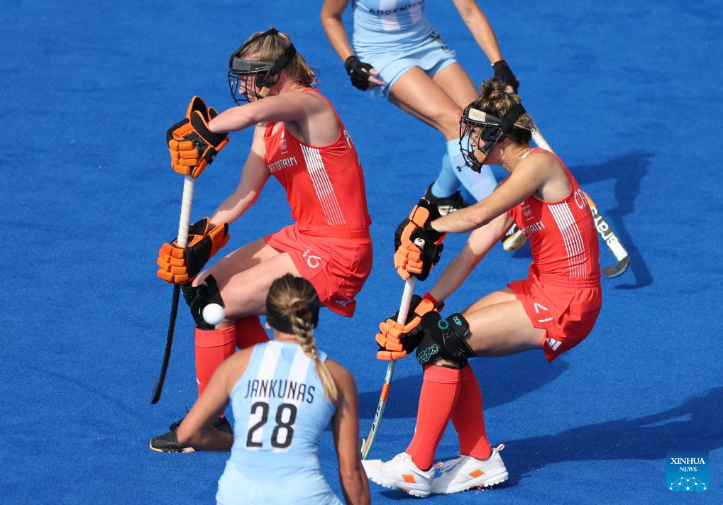 Players of Great Britain compete during the women's pool B match of hockey between Great Britain and Argentina in Colombes, northwest suburbs of Paris, France, Aug. 3, 2024. (Xinhua/Ren Pengfei)