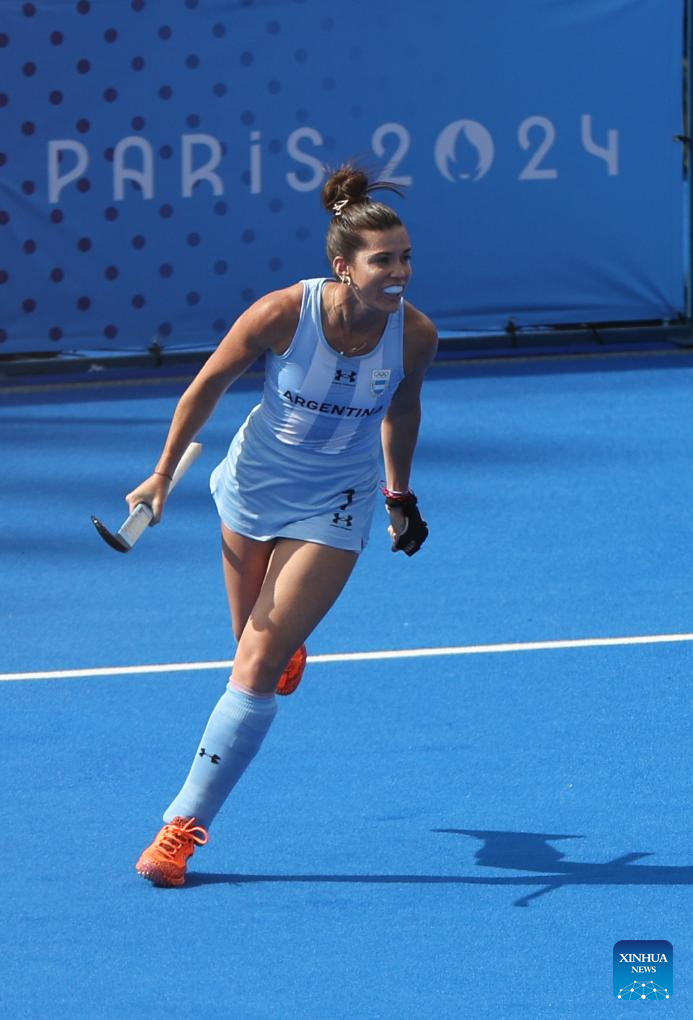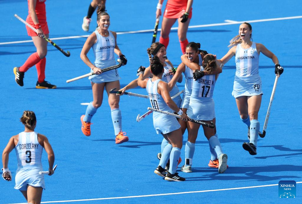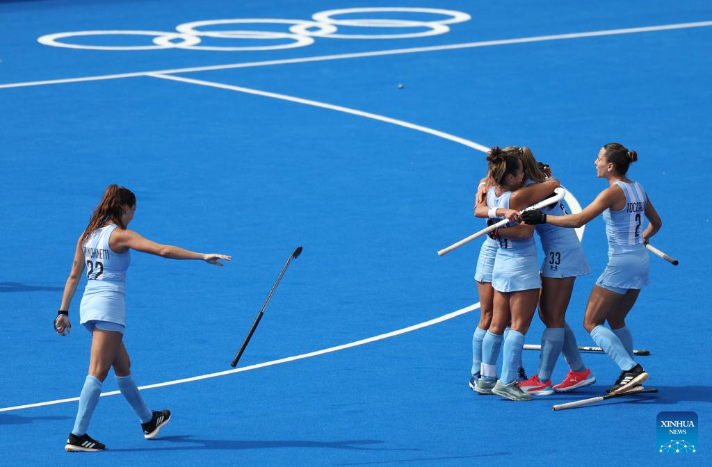 Players of Argentina celebrate scoring during the women's pool B match of hockey between Great Britain and Argentina in Colombes, northwest suburbs of Paris, France, Aug. 3, 2024. (Xinhua/Ren Pengfei)