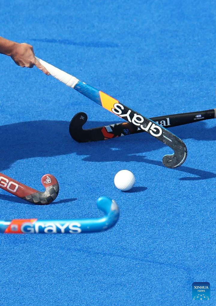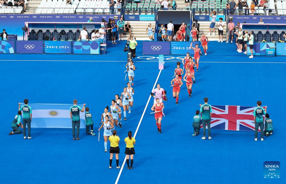 Players are seen before the women's pool B match of hockey between Great Britain and Argentina in Colombes, northwest suburbs of Paris, France, Aug. 3, 2024. (Xinhua/Ren Pengfei)
