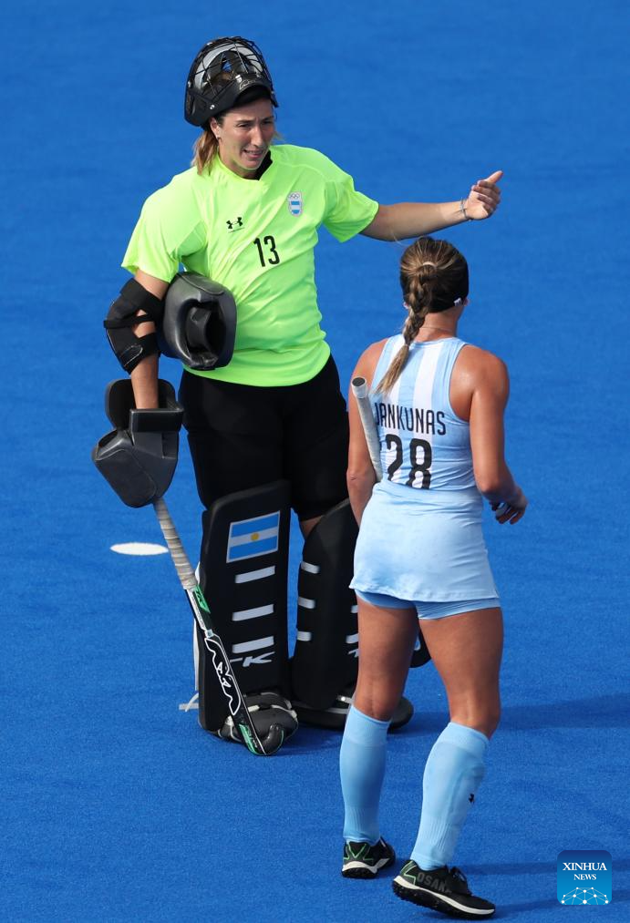 Goalkeeper of Argentina Cristina Cosentino (L) talks with teammate Julieta Jankunas during the women's pool B match of hockey between Great Britain and Argentina in Colombes, northwest suburbs of Paris, France, Aug. 3, 2024. (Xinhua/Ren Pengfei)