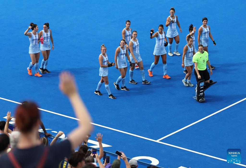 Players of Argentina react after the women's pool B match of hockey between Great Britain and Argentina in Colombes, northwest suburbs of Paris, France, Aug. 3, 2024. (Xinhua/Ren Pengfei)