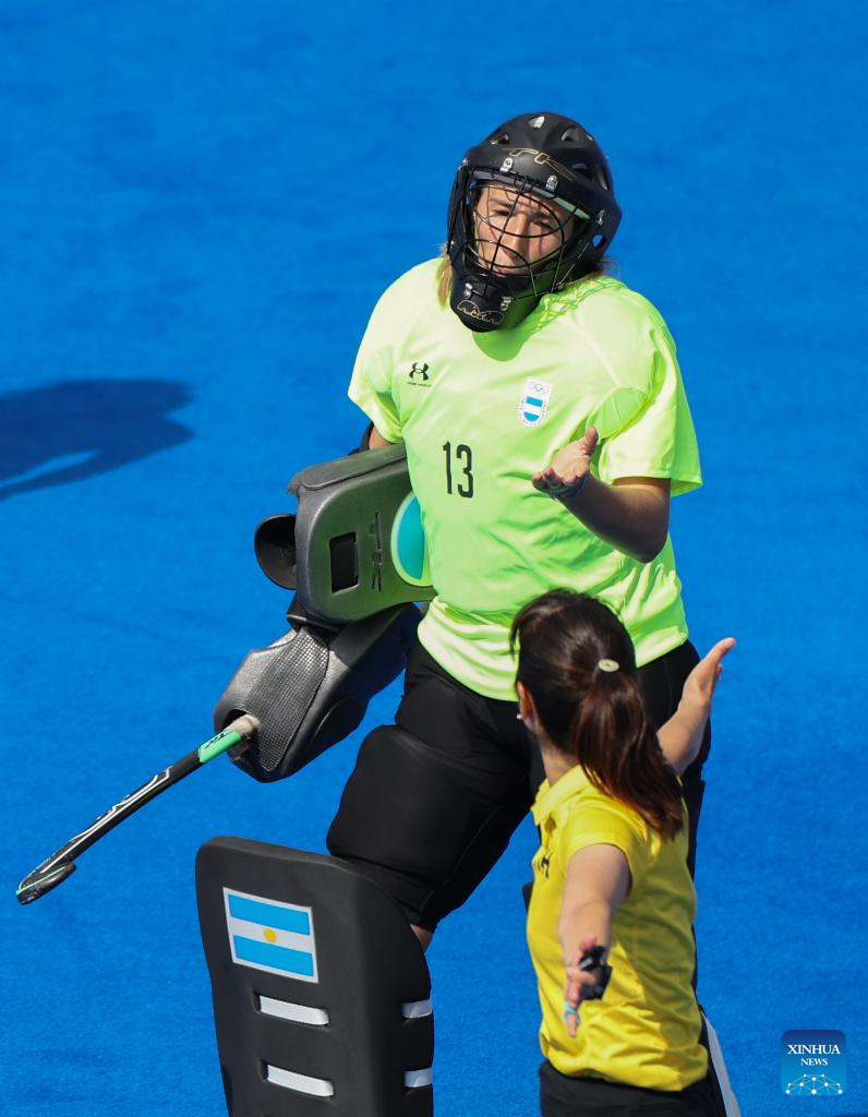 Goalkeeper of Argentina Cristina Cosentino (top) reacts during the women's pool B match of hockey between Great Britain and Argentina in Colombes, northwest suburbs of Paris, France, Aug. 3, 2024. (Xinhua/Ren Pengfei)