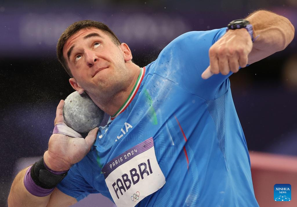 Leonardo Fabbri of Italy competes during the men's shot put final of athletics at the Paris 2024 Olympic Games in Paris, France, Aug. 3, 2024. (Xinhua/Li Ming)